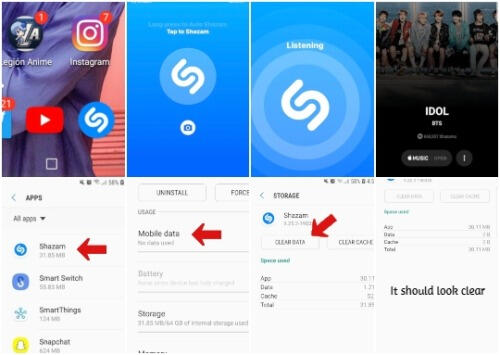 FOR ANDROID1. Download Shazam in the app store for free. Once downloaded, you will be asked for log in with your email or Facebook. We recommend Facebook.2. Once there, you will get a blue screen with the caption “Make a Shazam”.3. Play the song you want to find on speakers, and click on it, it should say “listening”.4. In a few seconds, the app should identify the song, so it will take you to the song details. In my case, I put on IDOL, and that’s why it shows up.5. Now, go to the menu of your phone and click on “Settings”, there will be many options, select “applications”. In applications, you will search for “Shazam” and go to “Storage”.6. Then, click on “delete data”, verify your answer and done, the shazams will be erased.Here is a graphic of the process:
