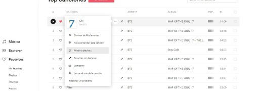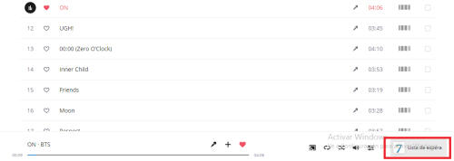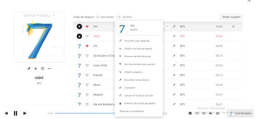 Importante: Una excelente función que tiene Deezer se denomina “lista de espera” y es una forma de hacer un playlist enfocado en la canción titulo controlada por Deezer. Por ejemplo, vamos a álbumes de BTS y abramos cualquiera, en mi caso abrí MAP OF THE SOUL 7. Una vez allí, coloca cualquier canción del álbum, coloque ON. Al estar allí, vamos a ver en la parte de abajo hay algo denominado lista de espera.